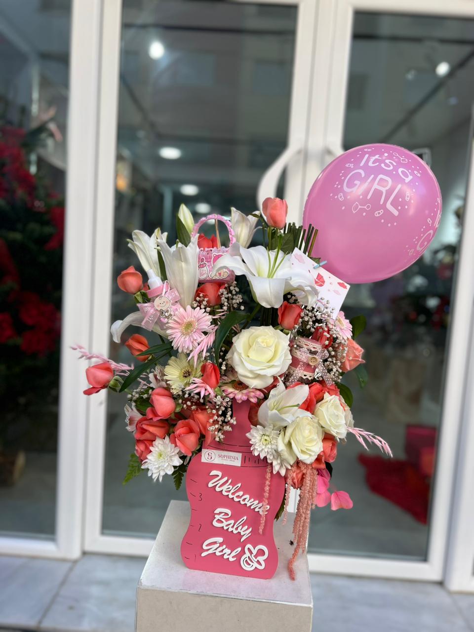 A delicate floral composition specially designed for celebrating the arrival of a baby girl, arranged in the charming shape of a baby bottle.